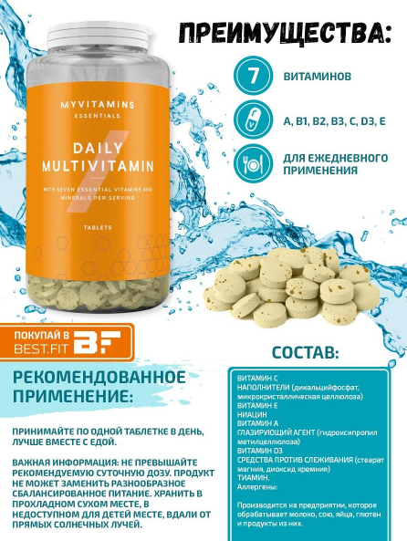 دیلی مولتی ویتامین مای ویتامینز ترکیبی بی نظیر از ویتامین های ضروری و مهم همچون ویتامین A، ویتامین C، ویتامین D3 ، ویتامین E، تیامین، ریبوفلاوین و نیاسین است. این محصول به شما کمک می کند نیازهای روزانه تان به ویتامین های مختلف را به راحتی تامین کنید. فرمولاسیونی که برای تهیه این مکمل به کار رفته شامل ویتامین C هم هست که از سلامت سیستم ایمنی پشتیبانی می کند و عملکرد شناختی تان را بهبود می بخشد. علاوه بر این، ویتامینA موجود در این مکمل سلامت پوست را بهتر می کند و از سلامت چشم هایتان پشتیبانی می کند.