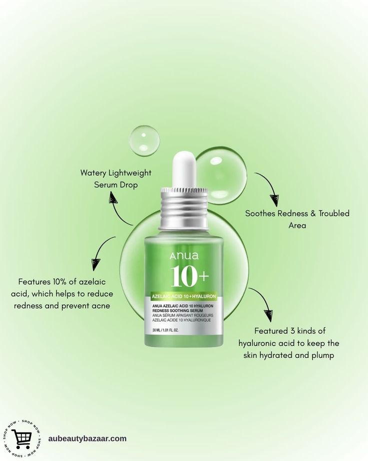 سرم آزلائیک اسید 10% هیالورون آنوا (Anua Azelaic Acid 10% + Hyaluron Redness Soothing Serum) سرمی پرطرفدار از برند کرهای آنوا در زمینه مراقبت از پوست است. این سرم با ترکیب آزلائیک اسید با غلظت ۱۰ درصد و هیالورونیک اسید، هم به درمان مشکلات پوستی نظیر آکنه، قرمزی، التهاب و لکهای پوستی کمک میکند و هم رطوبت و آرامش را برای پوست به ارمغان میآورد.